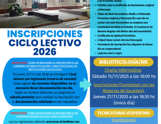 Estimada comunidad educativa de nuestro querido instituto, en el presente comunicado les informamos sobre el estado actual del proceso de inscripciones para nuestras carreras, correspondientes al Ciclo Lectivo 2026. 📚 Tecnicatura Superior en Bibliotecología y Bibliotecatura Superior en Bibliotecología de Instituciones Educativas (BIE) Se encuentra habilitada la lista de esperaRead More